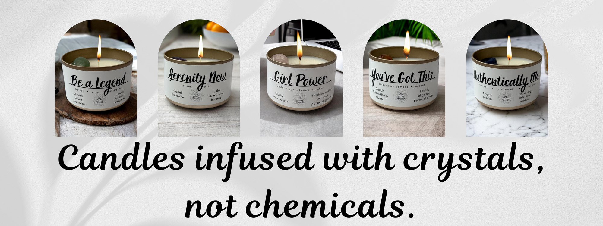 Our candles are infused with crystals, not chemicals. All of our hand poured candles are made with organic coconut wax, infused with ethically sourced crystals... never any toxins or dyes. Safe for your space, good for the planet, and designed for intentional self-care.