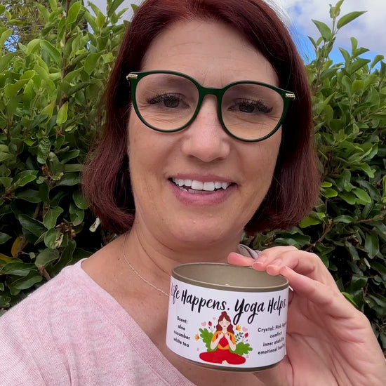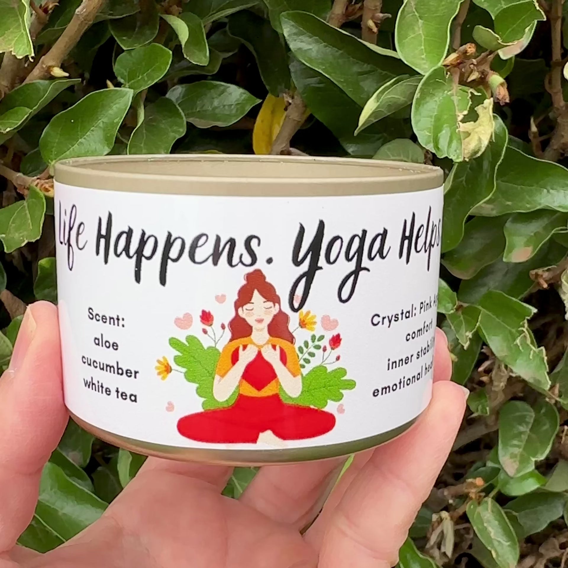 Find calm in the chaos with the "Life Happens. Yoga Helps." candle. Crisp notes of aloe, cucumber, and white tea create a soothing atmosphere that feels like a fresh start. Paired with Pink Botswana Agate, known for emotional renewal and inner strength, it’s a reminder that whatever life throws at you, yoga (and a little candlelight) always helps.