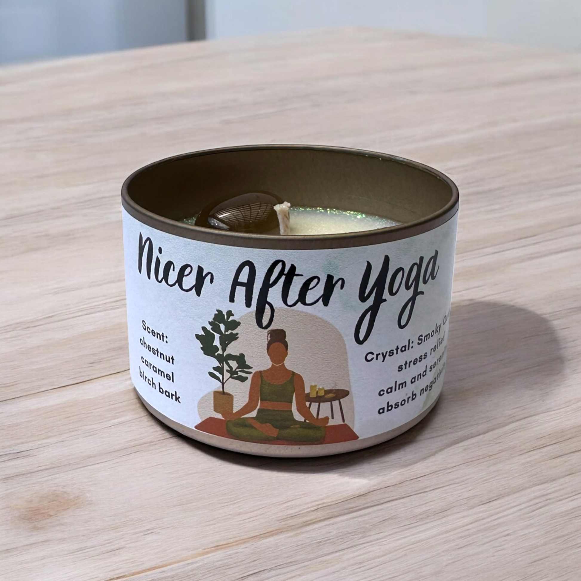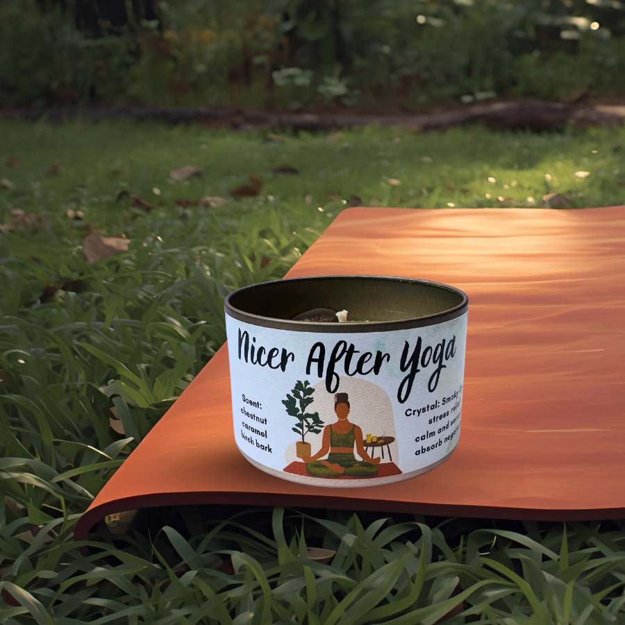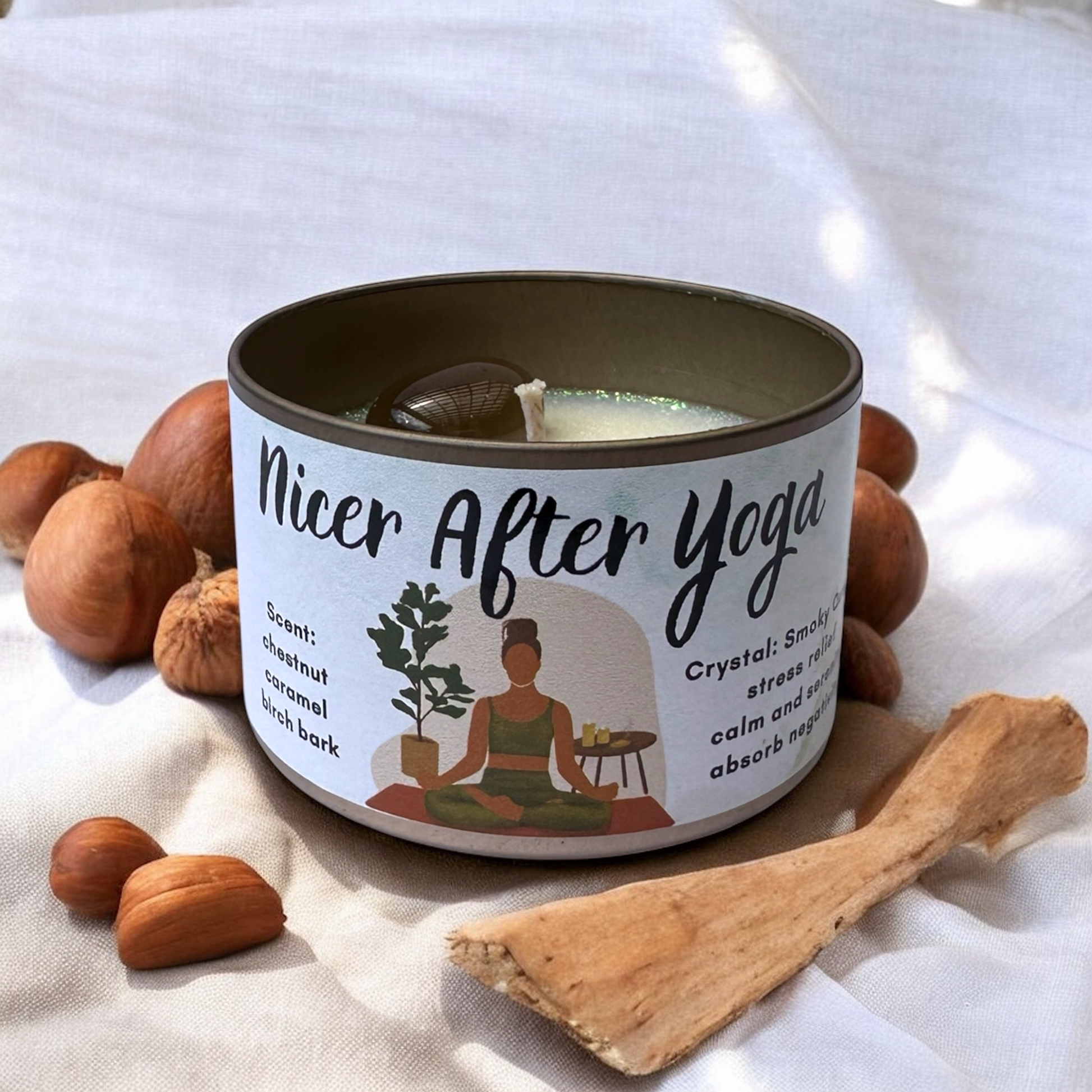 Bring calm to your space with the Nicer After Yoga candle. Its gentle notes of chestnut, caramel, and birch bark create a cozy, restorative atmosphere. Paired with smoky quartz, a crystal known for absorbing negativity and encouraging serenity, this candle is made for moments of release, reset, and renewal.
