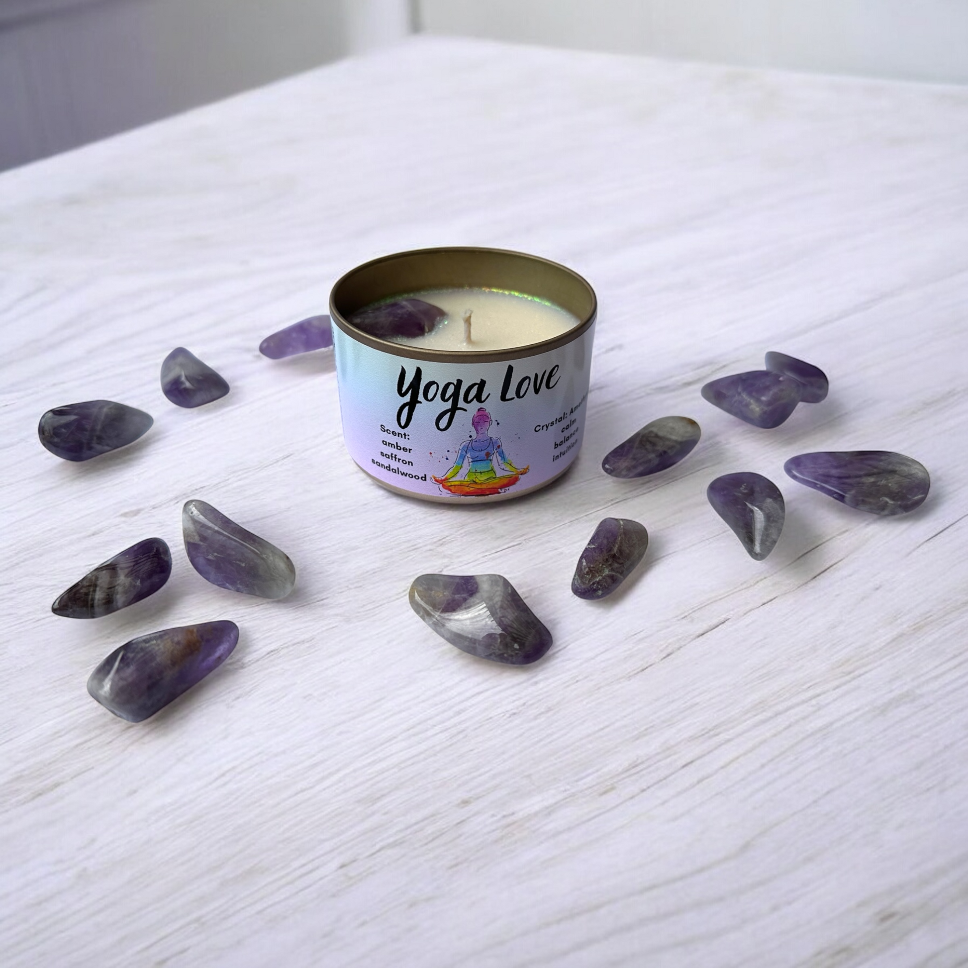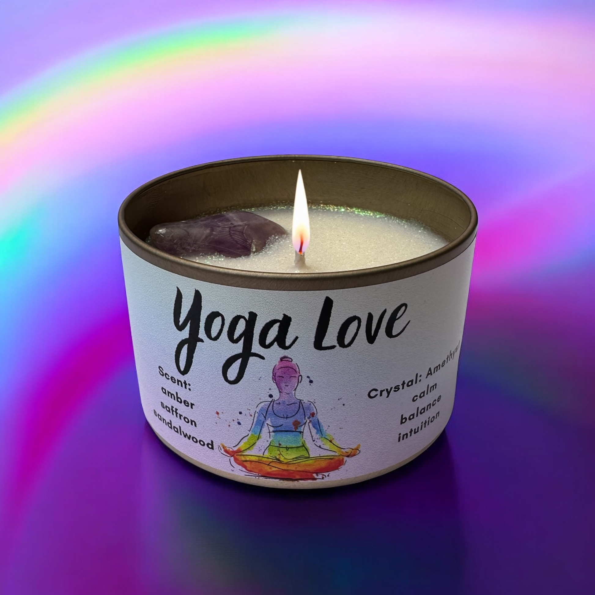 The Yoga Love Candle embraces the spirit of inclusivity and connection. Its warm blend of amber, saffron, and sandalwood creates a soothing atmosphere that welcomes all. Infused with amethyst, the stone of calm, balance, and intuition, this candle is perfect for centering your practice, finding stillness, or celebrating the beauty of love in every form.